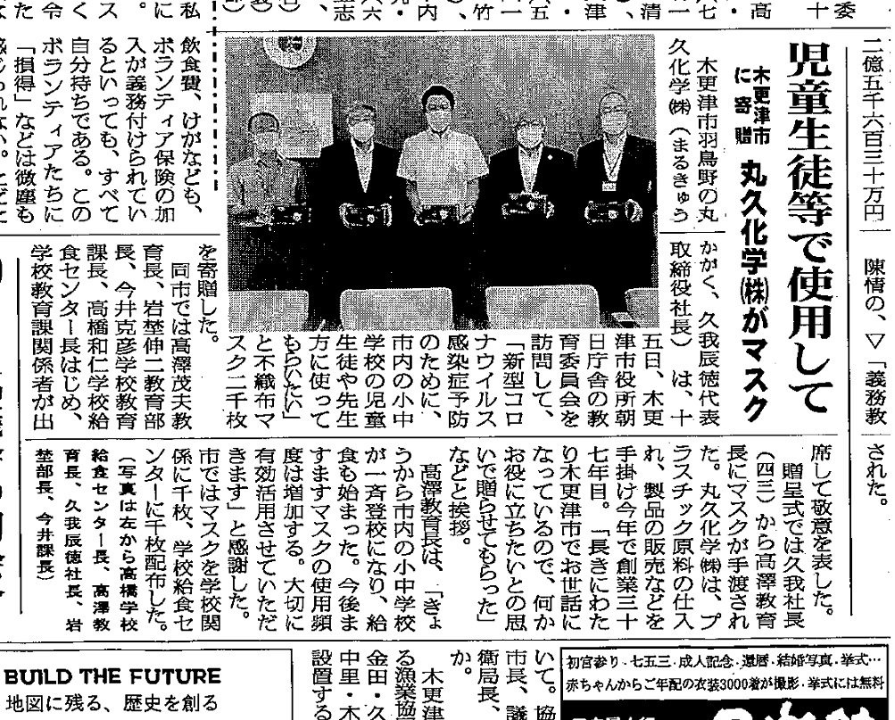 2020年6月15日、新型コロナウイルス感染拡大の影響によりマスクの需給が依然として逼迫した状況にあることから、木更津市へマスクの寄付をいたしました。(6月17日新千葉新聞掲載)